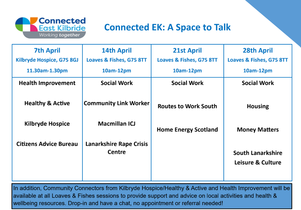 Residents of East Kilbride and surrounding areas are invited to attend, connect, and explore the support available. Whether you’re looking for help, want to ask a question, or simply need someone to listen—Connected East Kilbride: A Space to Talk is here for you.